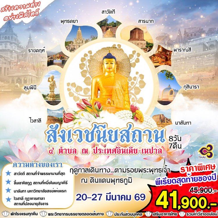 อ่านรายละเอียด ทัวร์ 4 สังเวชนียสถาน อินเดีย เนปาล ตามรอยพระพุธเจ้า 8 วัน 7 คืน -TG เพิ่มเติม (upd p220269)