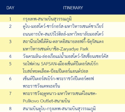 กำหนดการเดินทาง ทัวร์รัสเซีย มอสโคว์ ซาร์กอร์ส เซ็นต์ปีเตอร์สเบิร์ก 8 วัน - EK 2569