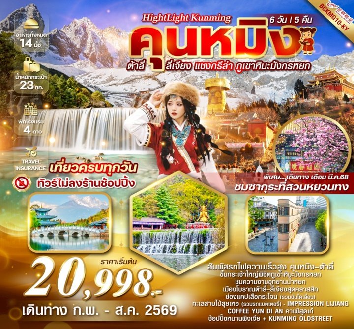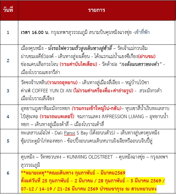 กำหนดการเดินทาง ทัวร์คุนหมิง ต้าลี่ ลี่เจียง แชงกรีล่า ภูเขาหิมะมังกรหยก 6 วัน -KY  2569