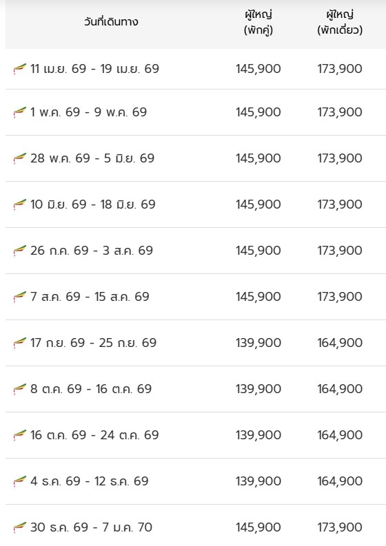 9 วัน 6 คืน (เมษา 2569 - ปีใหม่ 2570)