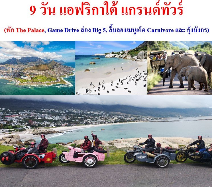 เคปทาวน์ – เทเบิ้ลเม้าท์เท่น – ล่องเรือชมพระอาทิตย์ตก – แหลมกู๊ดโฮป - ฟาร์มนกกระจอกเทศ – เกาะแมวน้ำ – เพนกวิน แอฟริกา - Sidecar มอเตอร์ไซค์วินเทจ Quad biking Atlantis Dunes - โจฮันเนสเบิร์ก – พริทอเรีย – สวนสิงโต– ซันซิตี้