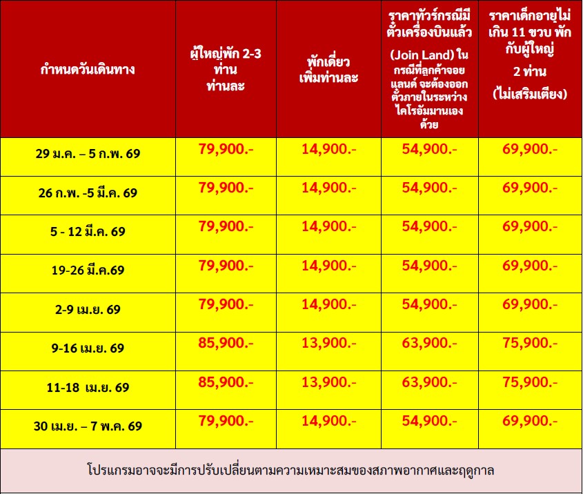 8 วัน 5 คืน (มกรา 2569 - เมษา 2569)