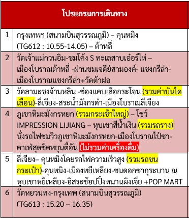 กำหนดการเดินทาง ทัวร์คุนหมิง ต้าหลี่ ลี่เจียง แชงกรีล่า หิมะมังกรหยก ซากุระ (ไม่ลงร้าน) 6 วัน -TG  2569