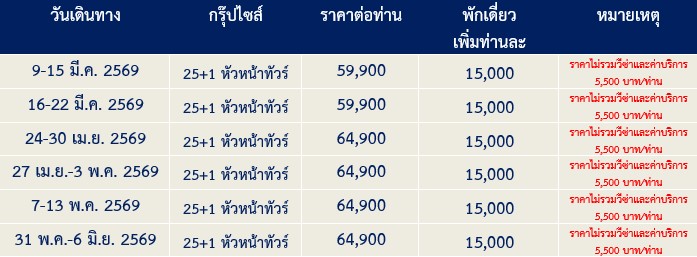 7 วัน 4 คืน (มีนา 2569 - พฤษภา 2569)