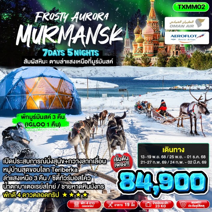 กำหนดการเดินทาง ทัวร์ล่าแสงเหนือ รัสเซีย มูร์มันสค์ (พัก igloo 1 คืน) 7 วัน 5 คืน -WY 2568-2569