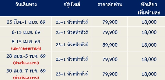 8 วัน 5 คืน (มีนา 2569 - เมษา 2569)
