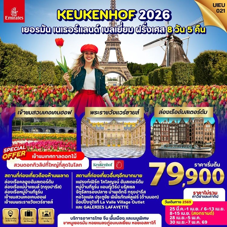 กำหนดการเดินทาง ทัวร์เคอเคนฮอฟ เยอรมัน เบลเยี่ยม เนเธอร์แลนด์ ฝรั่งเศส 8 วัน 5 คืน -EK 2569