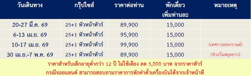 8 วัน 5 คืน (มีนา 2569 - พฤษภา 2569)