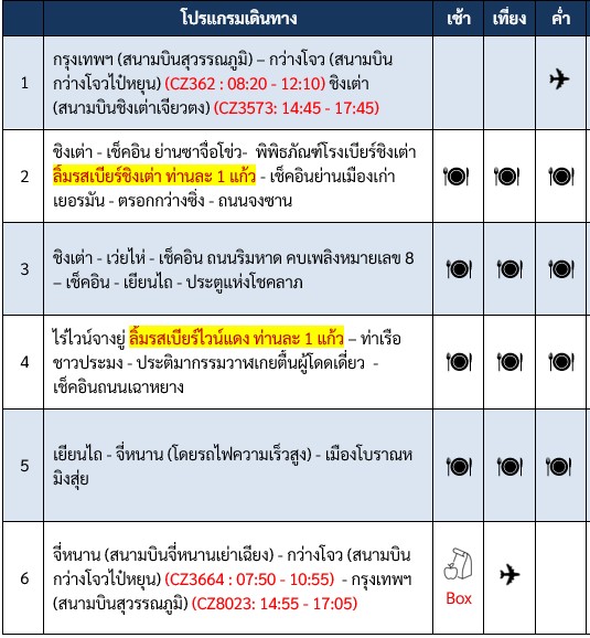 กำหนดการเดินทาง ทัวร์ชิงเต่า เยียนไถ เว่ยไห่ จี่หนาน 6 วัน 5 คืน -CZ 2569ไฮไลท์ ทัวร์ชิงเต่า เยียนไถ เว่ยไห่ จี่หนาน 6 วัน 5 คืน -CZอ่านรายละเอียด ทัวร์ชิงเต่า เยียนไถ เว่ยไห่ จี่หนาน 6 วัน 5 คืน -CZ เพิ่มเติม (upd p251168)