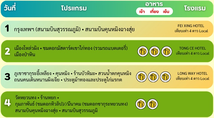 กำหนดการเดินทาง ทัวร์คุนหมิง โหล่วผิง ทุ่งดอกมัสตาร์ด เมืองป่าหิน 4 วัน 3 คืน -KY 2569