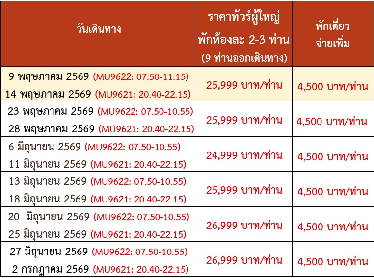 6 วัน 5 คืน (พฤษภา 2569 - มิถุนา 2569)