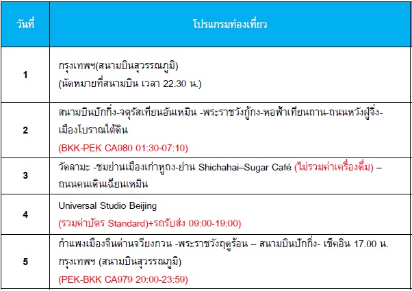 กำหนดการเดินทาง ทัวร์จีน ปักกิ่ง กำแพงเมืองจีน Universal Studio 5 วัน 3 คืน -CA 2569
