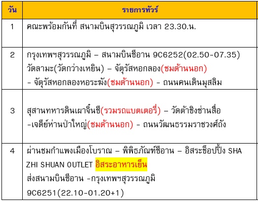 กำหนดการเดินทาง ทัวร์จีน ซีอาน สุสานทหารจิ๋นซี ไม่ลงร้าน 4 วัน 2 คืน -9C 2569ไฮไลท์ ทัวร์จีน ซีอาน สุสานทหารจิ๋นซี ไม่ลงร้าน 4 วัน 2 คืน -9Cอ่านรายละเอียด ทัวร์จีน ซีอาน สุสานทหารจิ๋นซี ไม่ลงร้าน 4 วัน เพิ่มเติม (upd p200369)