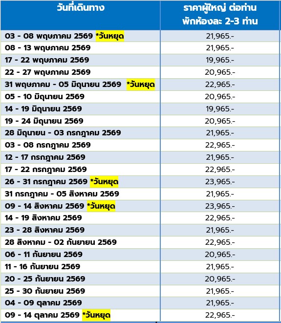 6 วัน 5 คืน (พฤษภา 2569 - ตุลา 2569)